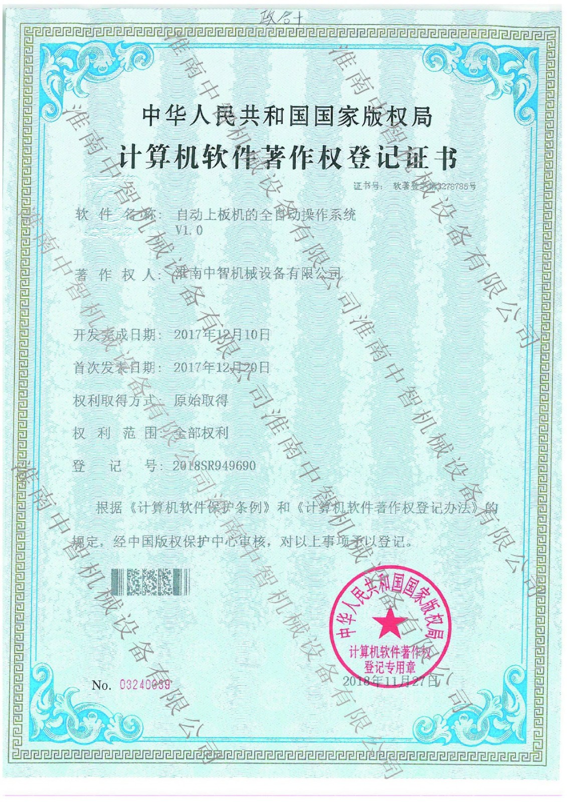 淮南BBV在线官网机械自动上板机全自动操作系统专利证书