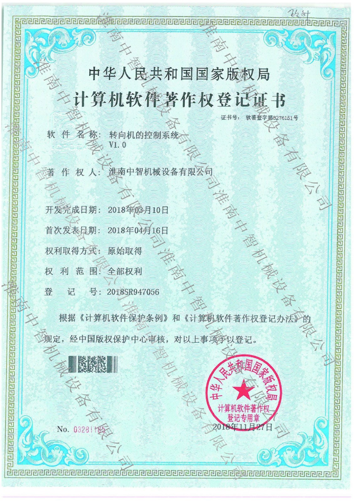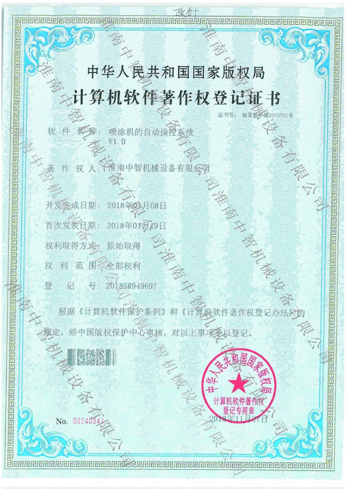 淮南BBV在线官网机械喷涂机的自动操控系统专利证书