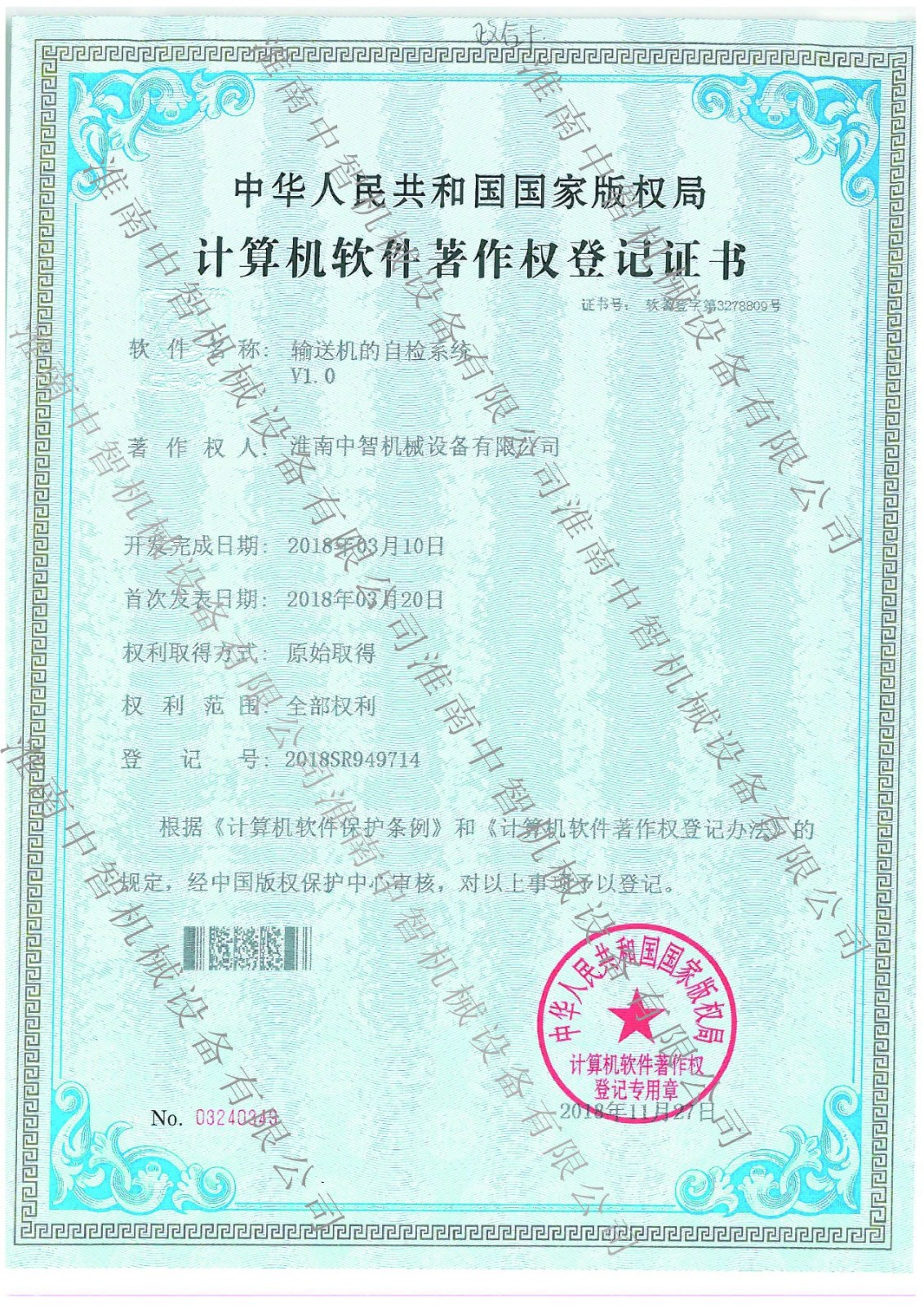 淮南BBV在线官网机械输送机的自检系统专利证书